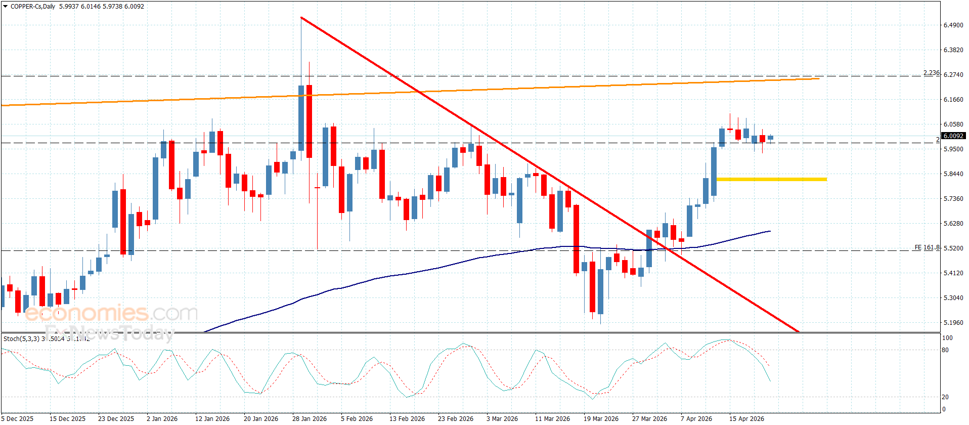 Kopparpriset har inte rört sig något sedan igår genom sin fluktuation nära det initiala stödet på 5,9700 dollar, på grund av motsägelser mellan huvudindikatorerna, genom att ge negativ momentum från stokastiska indikatorer, som stabiliseras under 50-nivån.