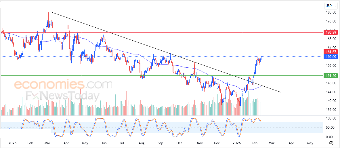 Därför förväntar vi oss att aktiekursen kommer att stiga i kommande handel, särskilt om den bryter över motståndsnivån på 161,65 dollar, med målet att nå nästa motståndsnivå på 170,00 dollar.